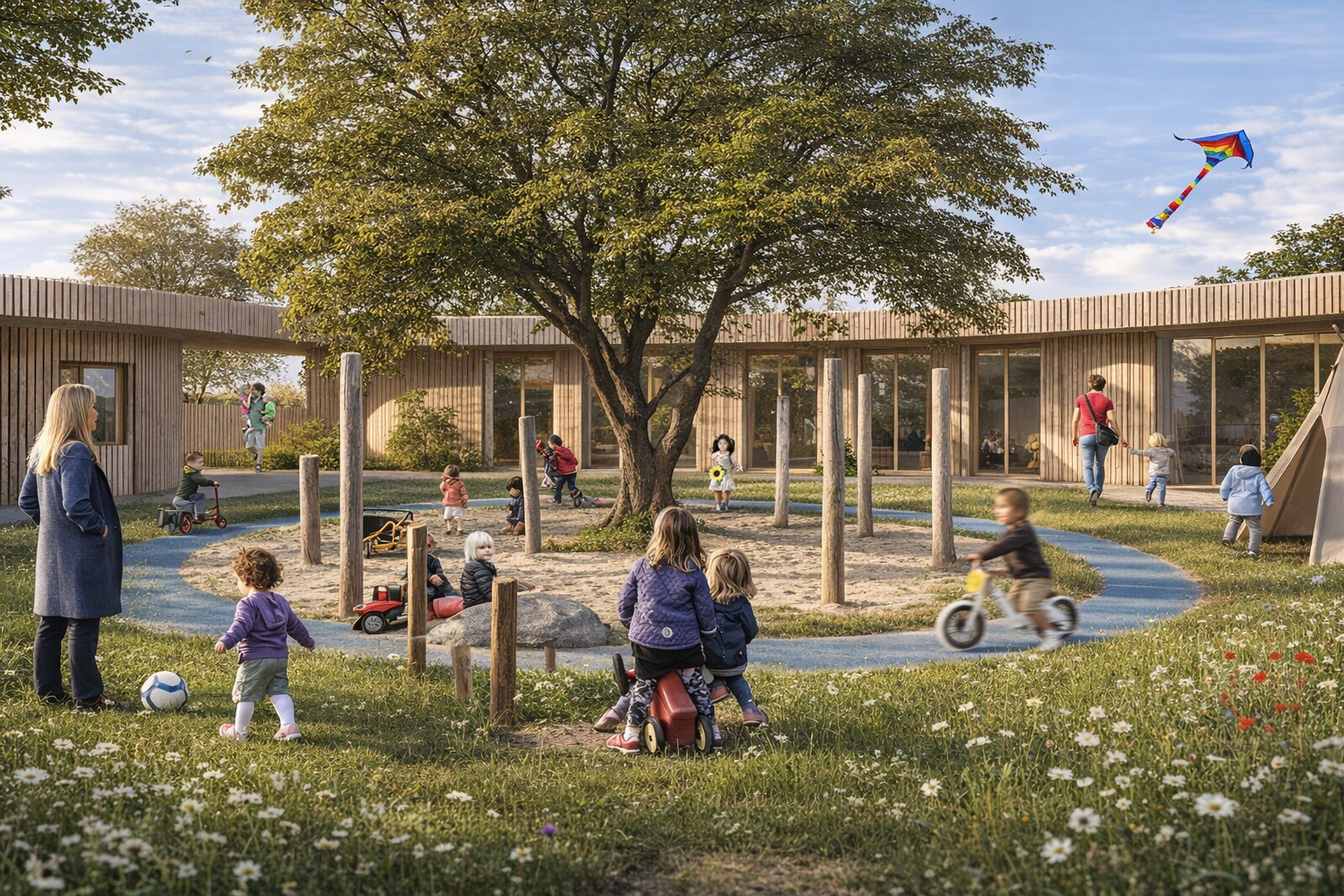 Construction d’un « cocon », un bâtiment à l’échelle des enfants en forme d’arc de cercle. Cette forme induit une intériorité, un jardin centré et protégé, une oasis verdoyante.